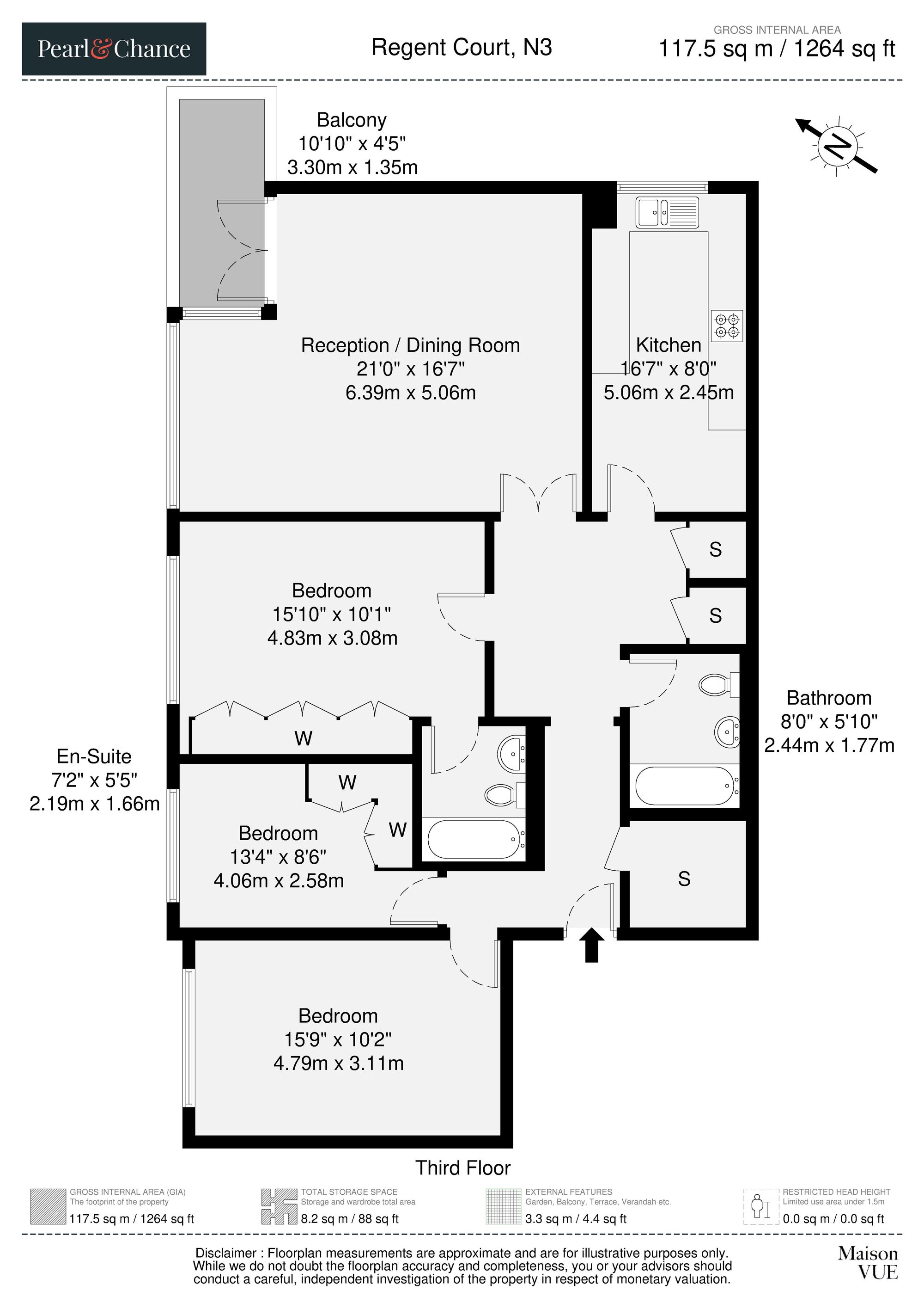 Available now, this spacious three double bedroom flat at Regent Court is located in the heart of Finchley Central on the third floor with lift access and extends to 1,264 sq ft. The property is offered unfurnished and includes a 21 ft reception and dining room opening onto a private balcony, a separate 16 ft kitchen, and three double bedrooms. The principal bedroom has built-in wardrobes and an en-suite bathroom, while the two further bedrooms are fitted with wardrobes. A second family bathroom completes the layout. Wooden flooring runs throughout, and there is excellent storage across the flat, including fitted cupboards in the hallway.